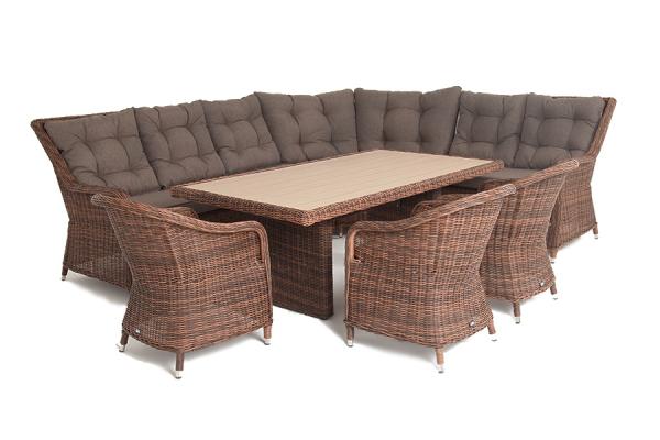 Угловая модульная обеденная группа. Искусственный ротанг, плетение круглое, цвет коричневый,алюминиевый каркас. Столешница из ДПК. "Бергамо" плетеный угловой диванный модуль, цвет коричневый 1шт. 1 630Х900Х990, "Бергамо" плетеный левый модуль дивана, цвет коричневый 1шт. 1 150Х900Х990, "Бергамо" плетеный правый модуль дивана, цвет коричневый 1шт. 1 150Х900Х990, "Бергамо" плетеный центральный модуль дивана, цвет коричневый 1шт. 900Х550Х990, "Бергамо" плетеный обеденный стол, цвет коричневый 1шт. 1 800Х1 000Х680, "Равенна" плетеное кресло из искусственного ротанга, цвет коричневый с серой подушкой 3шт. 570Х680Х810,