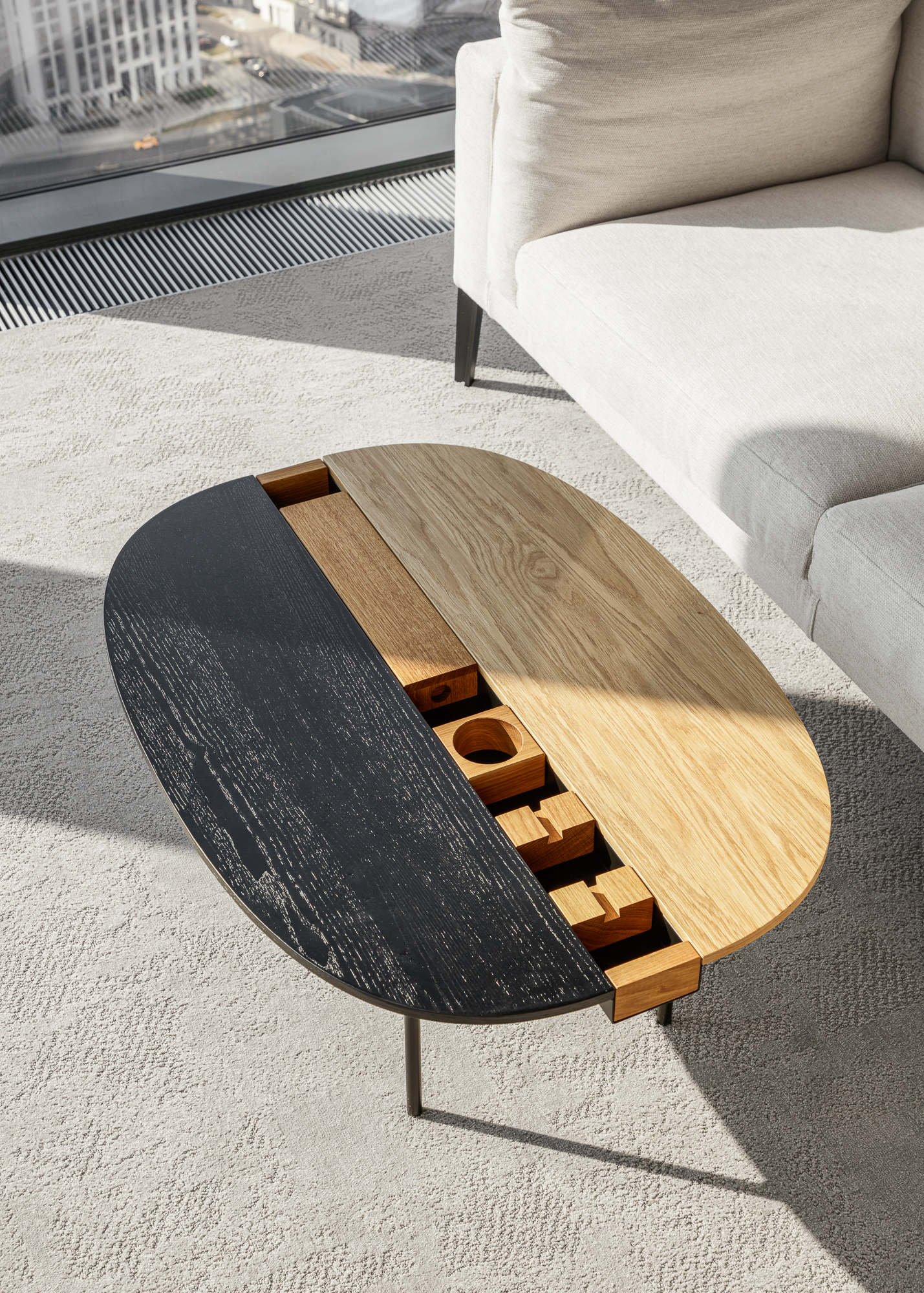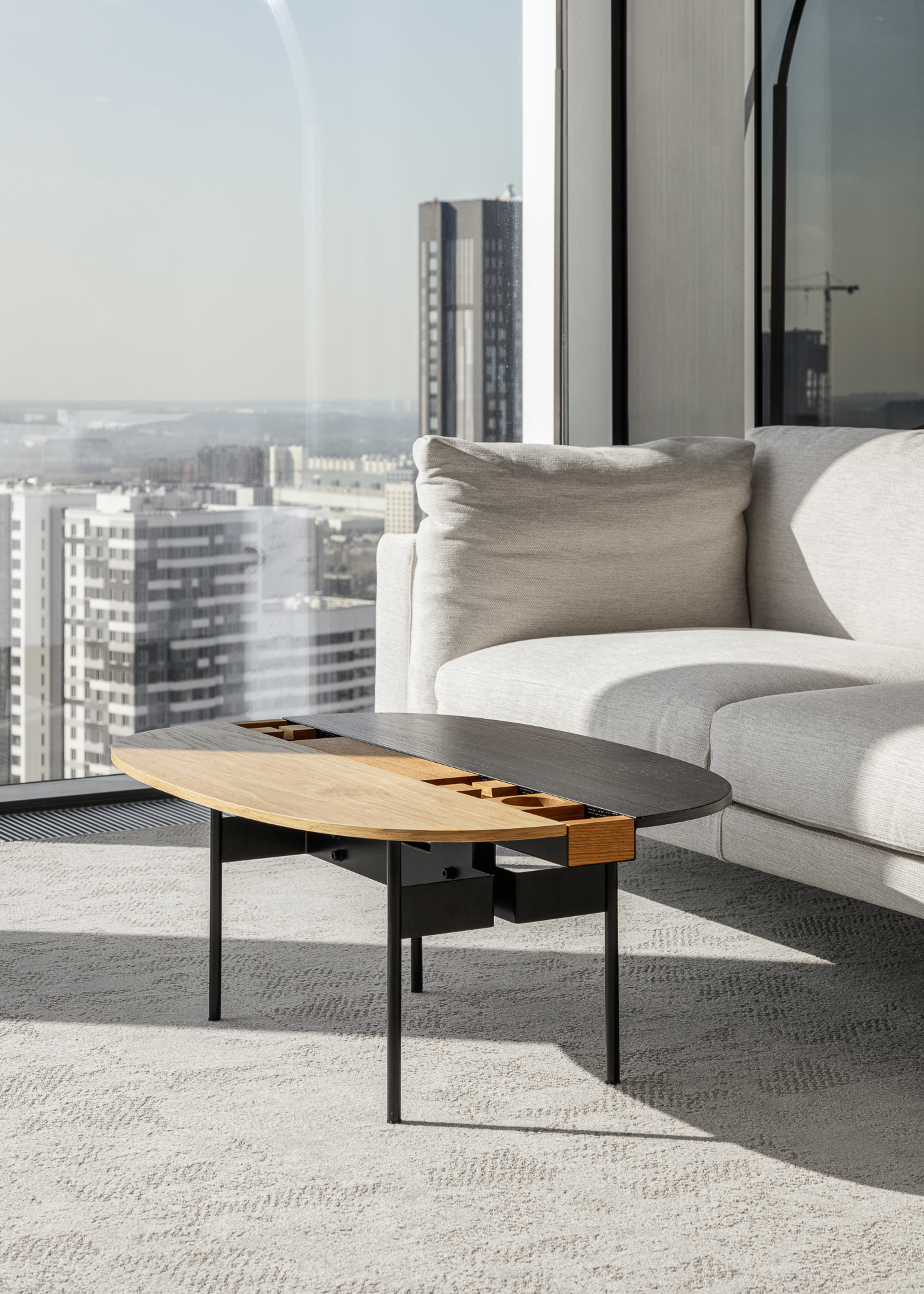 Функциональный столик Between от российского бренда Zahodi в уникальном дизайне – идеальное решение для размещения и хранения журналов, напитков и других вещей, которыми вы пользуетесь повседневно. Мягкие формы и компактные размеры позволят разместить изделие не только в просторных гостиных, но и в небольших помещениях. Прочное металлическое основание обеспечивает устойчивость и надежность. Столешница, покрытая натуральным шпоном, не только придает изделию эстетичный внешний вид и элегантность, но и обеспечивает гигиеничность и комфорт при использовании.