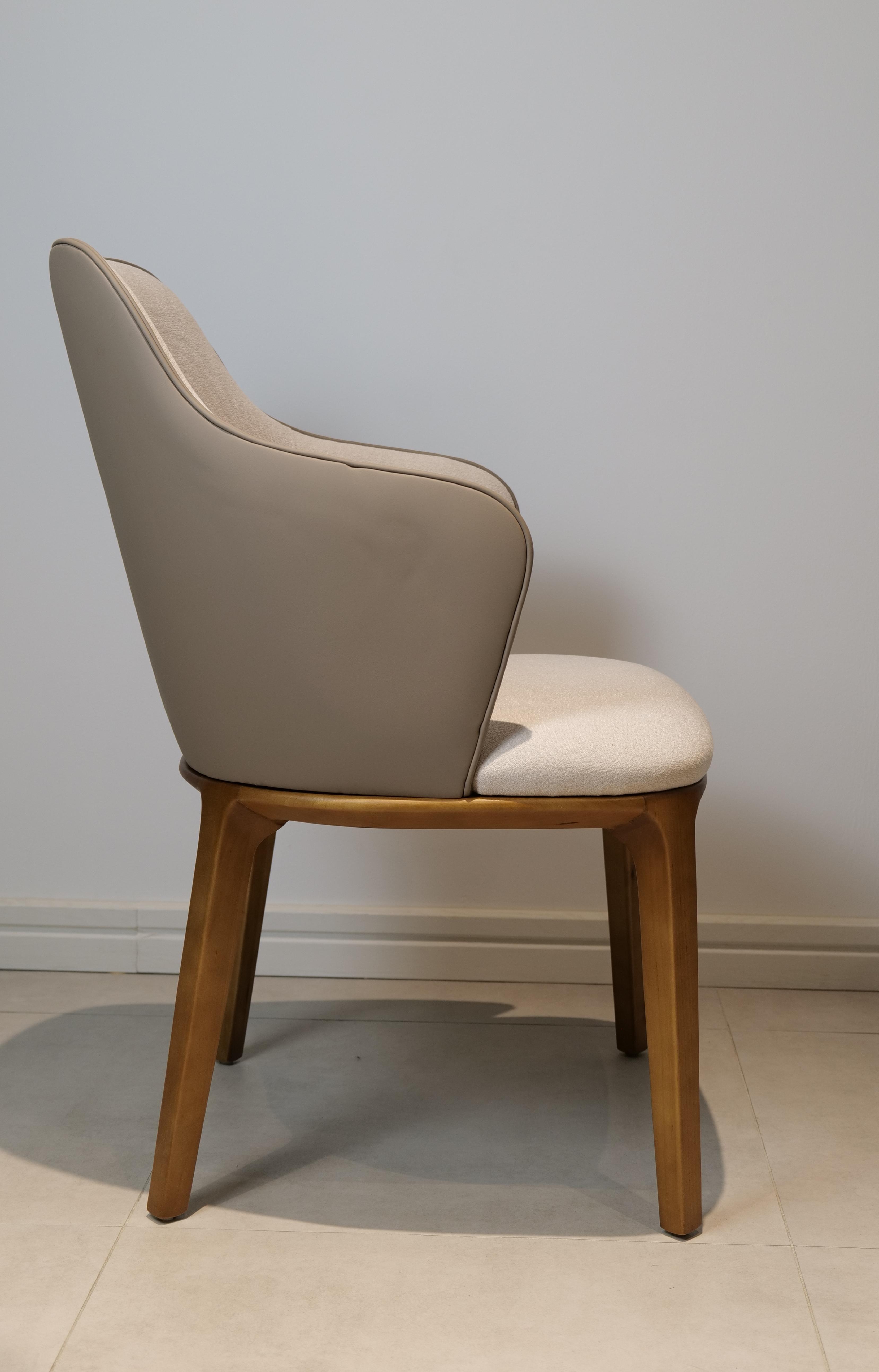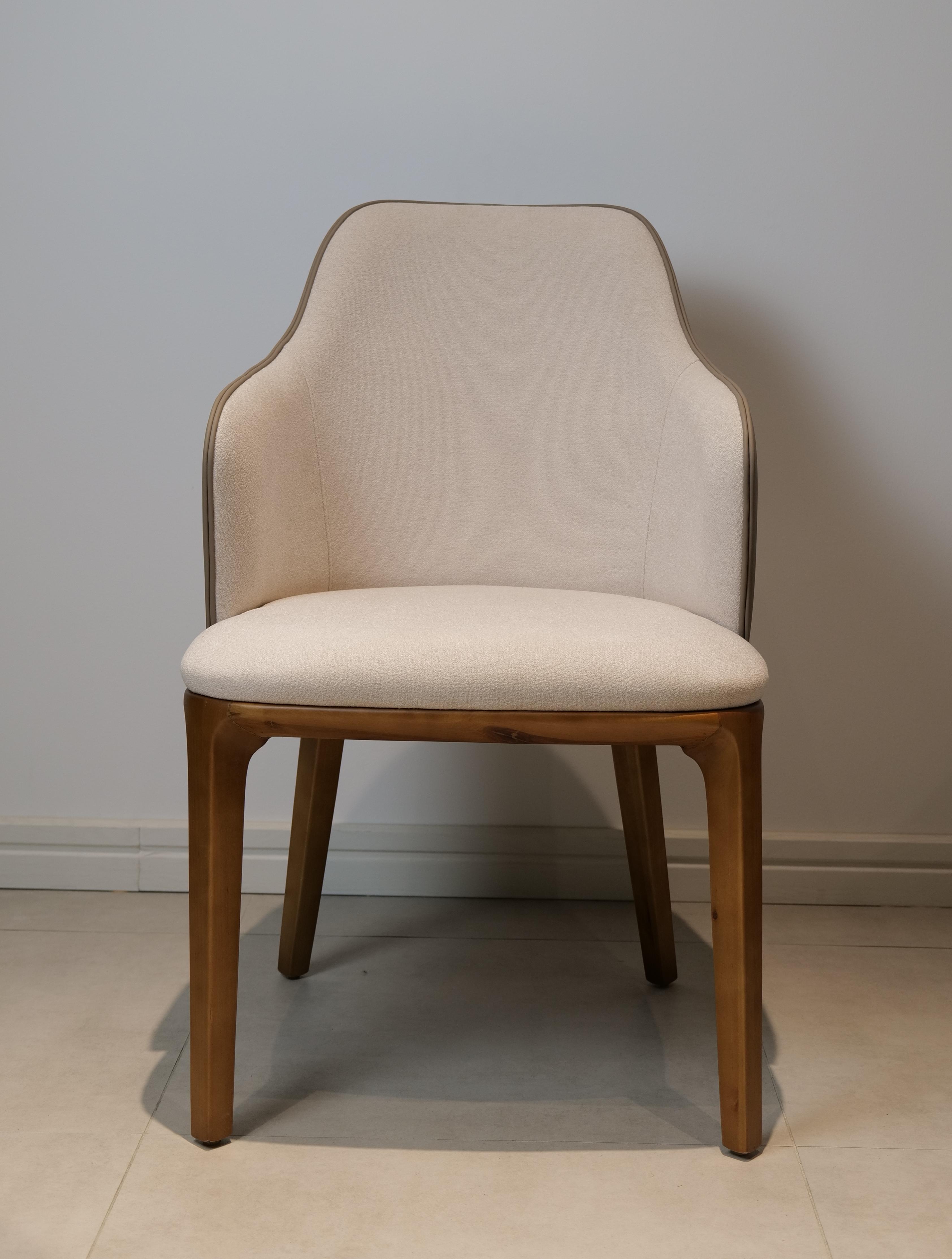 Обивка из велюра бежевого оттенка, ножки – массив дерева в оттенке ореха. Благодаря компактному размеру и классической «кабинетной» цветовой гамме, полукресло подходит как для обеденной группы в столовой комнате или гостиной, так и для письменного стола в небольшом кабинете.