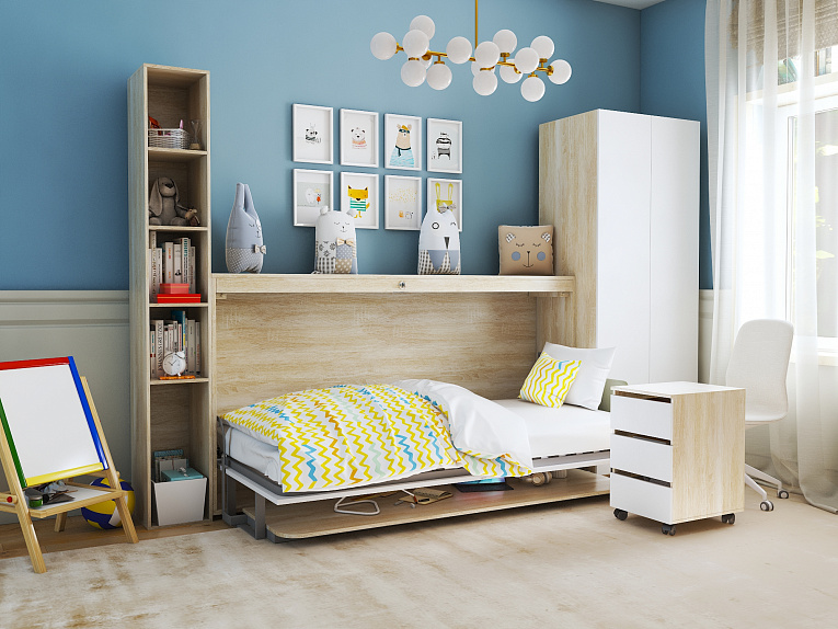 Комплект детской мебели с горизонтальной откидной кроватью со столом имеет все необходимое в своей конструкции для оптимизации места в детской комнате – кровать-трансформер, рабочий стол и шкафы для личных вещей. При необходимости вы можете приобрести дополнительные модули.