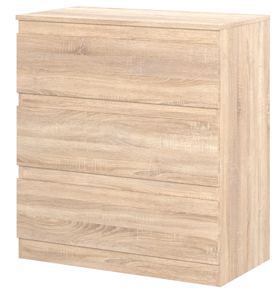 Комод оснащен тремя ящиками, что позволяет удобно разместить белье, одежду или другие предметы. Скошенные ручки на фасадах делают использование комода еще более комфортным.