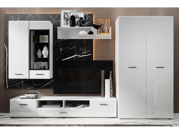 Гостиная Глосс — эстетичное и функциональное решение для меблировки современной гостиной. Глянцевая поверхность белых фасадов придает помещению легкости и визуально увеличивает пространство комнаты. Благодаря вместительному шкафу, навесным модулям и широкой тумбе под ТВ, в гостиной найдется место для хранения любых вещей.