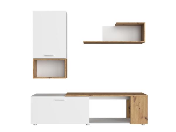 В комплект гостиной входят: навесная полка, шкаф с полкой и тумба под ТВ, что позволяет максимально эффективно использовать пространство и организовать хранение различных предметов.
