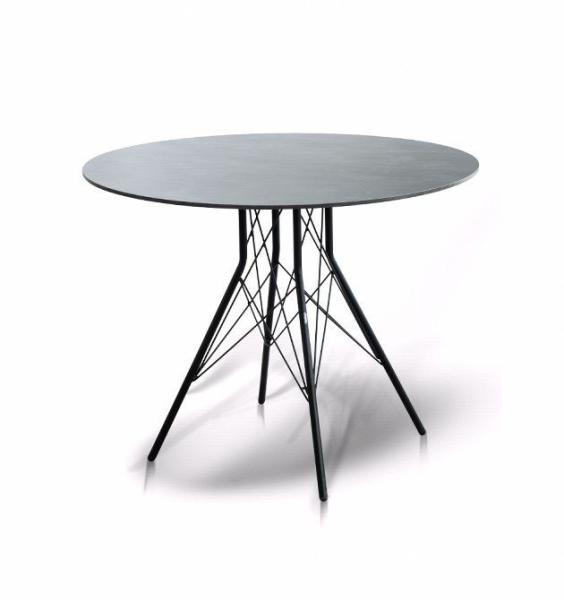 Интерьерный круглый стол «Конте» в современном стиле лофт. Каркас изготовлен из стали, окрашенной в матовый черный цвет. В качестве столешницы использован высококачественный монолитный компакт-пластика HPL, толщиной 12 мм. Цвет поверхности – «серый гранит».