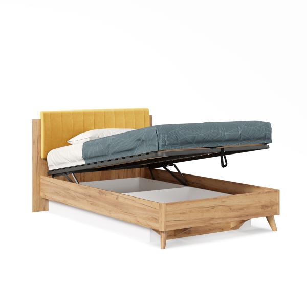 Кровать Марта-2 с мягким велюровым изголовьем в цвете горчица с вертикальной стяжкой, и подъемным механизмом вполне уместна будет и в спальне подростка, и в комнате молодой девушки или молодого парня и в комнате, где предпочитает отдыхать человек почтенного возраста.