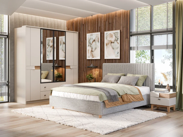В спальне Нильс воплощены лучшие черты современного европейского дизайна! Теплой и уютной делает спальню сочетание двух текстур: древесная и матовый кашемир.