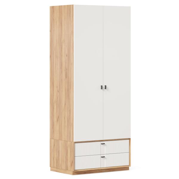 • Шкаф разделен на 2 отделения: нижнее с двумя ящиками друг под другом на направляющих нижнего крепления не полного выдвижения с доводчиком и верхнее - за распашными дверями с отделением для шляп и штангой для одежды под верхней полкой.