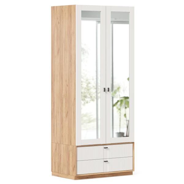 • Шкаф разделен на 2 отделения: нижнее с двумя ящиками друг под другом на направляющих нижнего крепления не полного выдвижения с доводчиком и верхнее - за распашными дверями с зеркалами с отделением для шляп и штангой для одежды под верхней полкой.