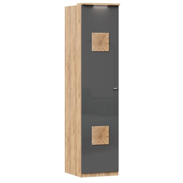 • За распашным фасадом в цвете «Антрацит» глянец с декоративными накладками (в одном комплекте 2 накладки) 6 полок и штанга для одежды. Высота между полками 300 мм.