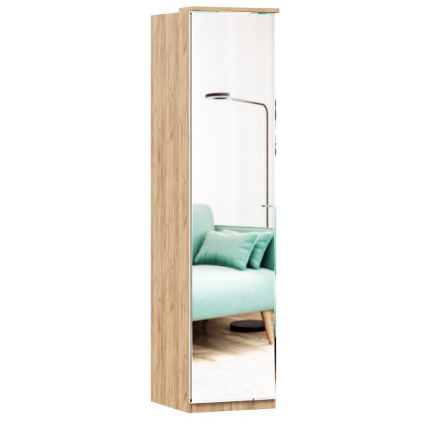 • За распашным зеркальным фасадом 6 полок и штанга для одежды. Высота между полками 300 мм.