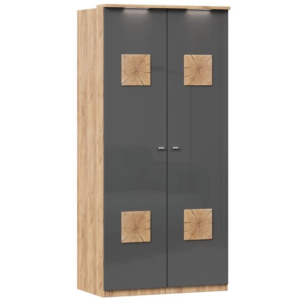 • За 2 распашными фасадами в цвете «Антрацит» глянец с декоративными накладками (в одном комплекте 2 накладки) 3 полки и штанга для одежды. Высота ниши со штангой 1250 мм.