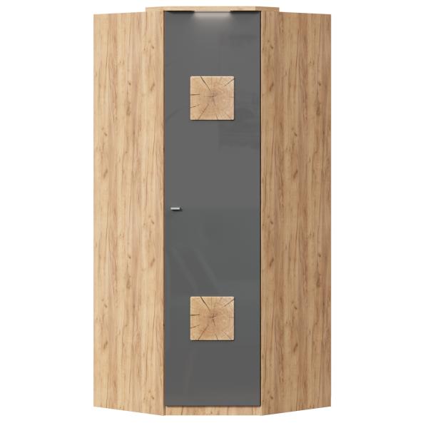 • За распашной дверью в цвете «Антрацит» глянец с двумя декоративными накладками две ниши: слева 6 полок шириной 370 мм, расстояние между полками 300 мм, справа 3 полки шириной 951 мм и штанга для одежды. Высота ниши со штангой 1250 мм.