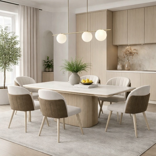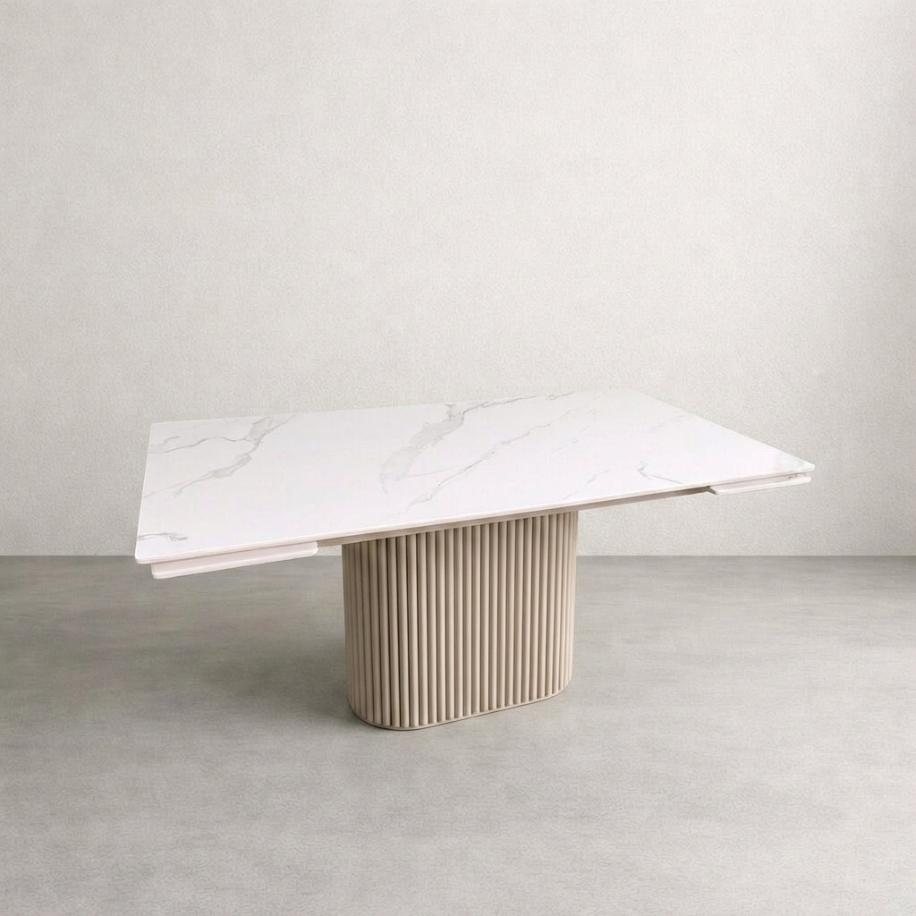 Столешница выполнена из высококачественного керамогранита. Этот материал превосходит керамику по прочности и твердости, сохраняя при этом все её лучшие качества. Белая матовая поверхность с текстурой натурального камня устойчива к царапинам, сколам, воздействию влаги и высоких температур. За столом можно не бояться пролитого вина или горячей сковороды — он создан для активной жизни.