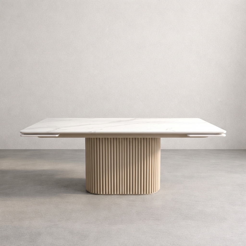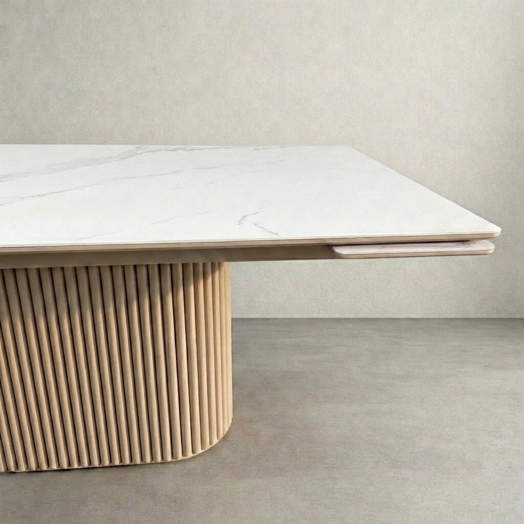 Форма стола — строгий прямоугольник с идеальным углом 90 градусов. Дизайн здесь строится на контрасте: холодная красота камня и теплый оттенок опор «Капучино» создают продуманный и современный образ, лишенный лишнего декора, но полный достоинства.