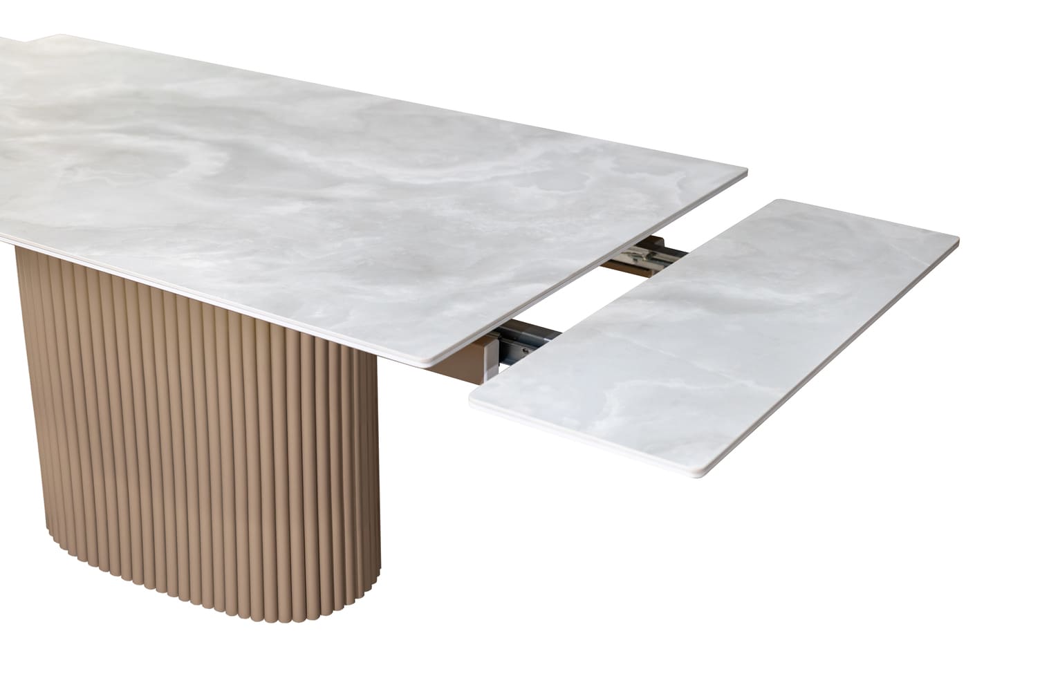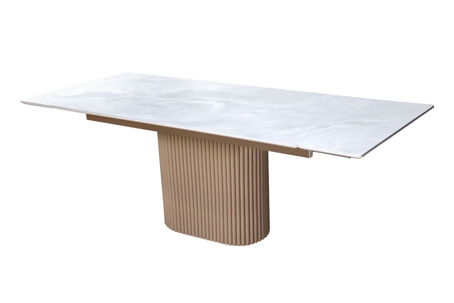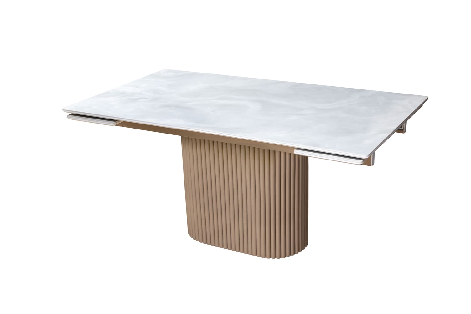 Столешница из оптивайт стекла с фотопечатью или керамики добавляет уникальности, а прочная металлическая опора с порошковой окраской обеспечивает стабильность.