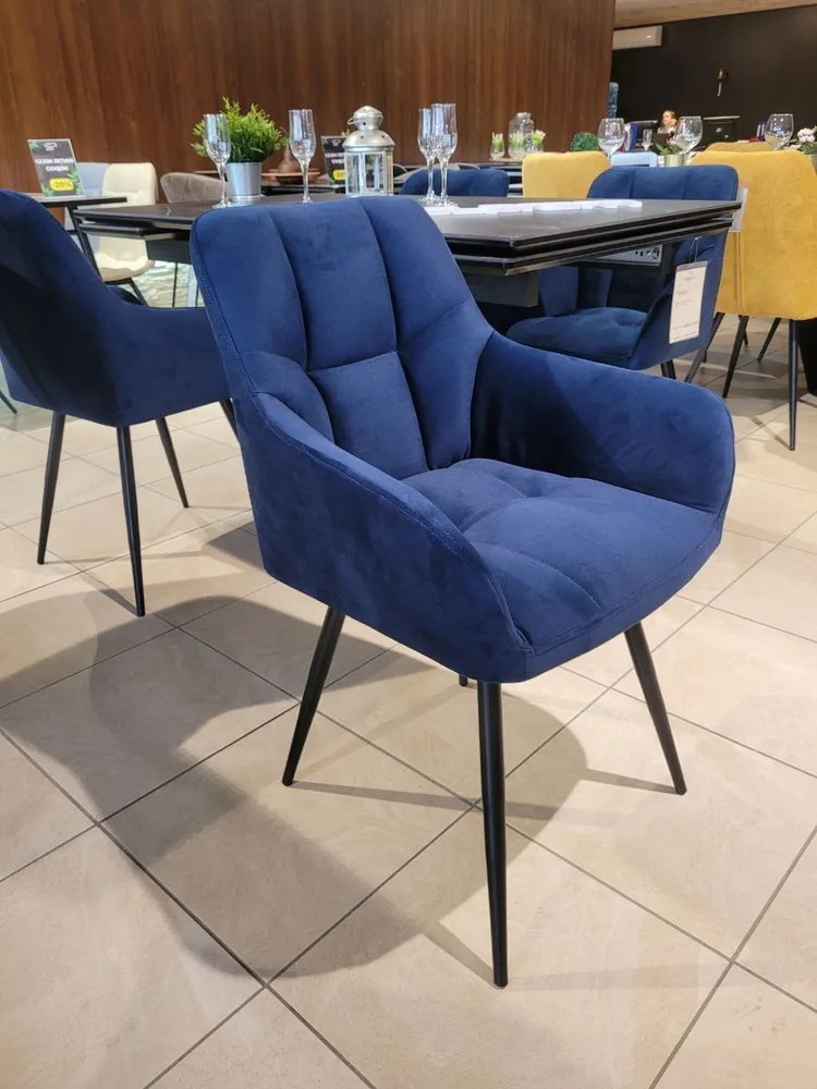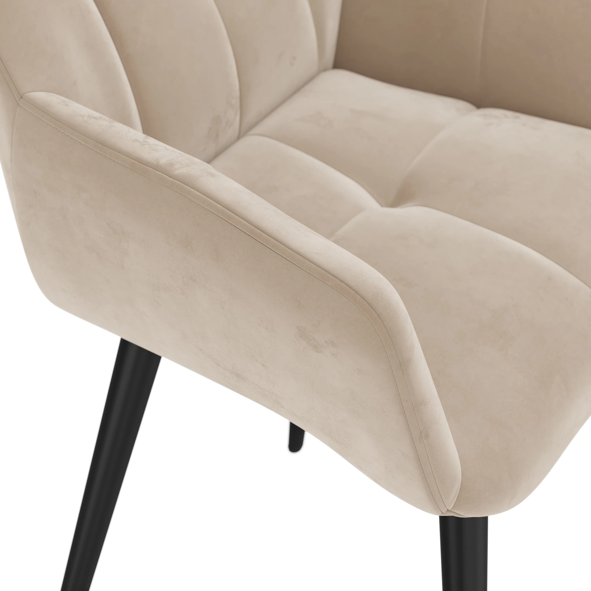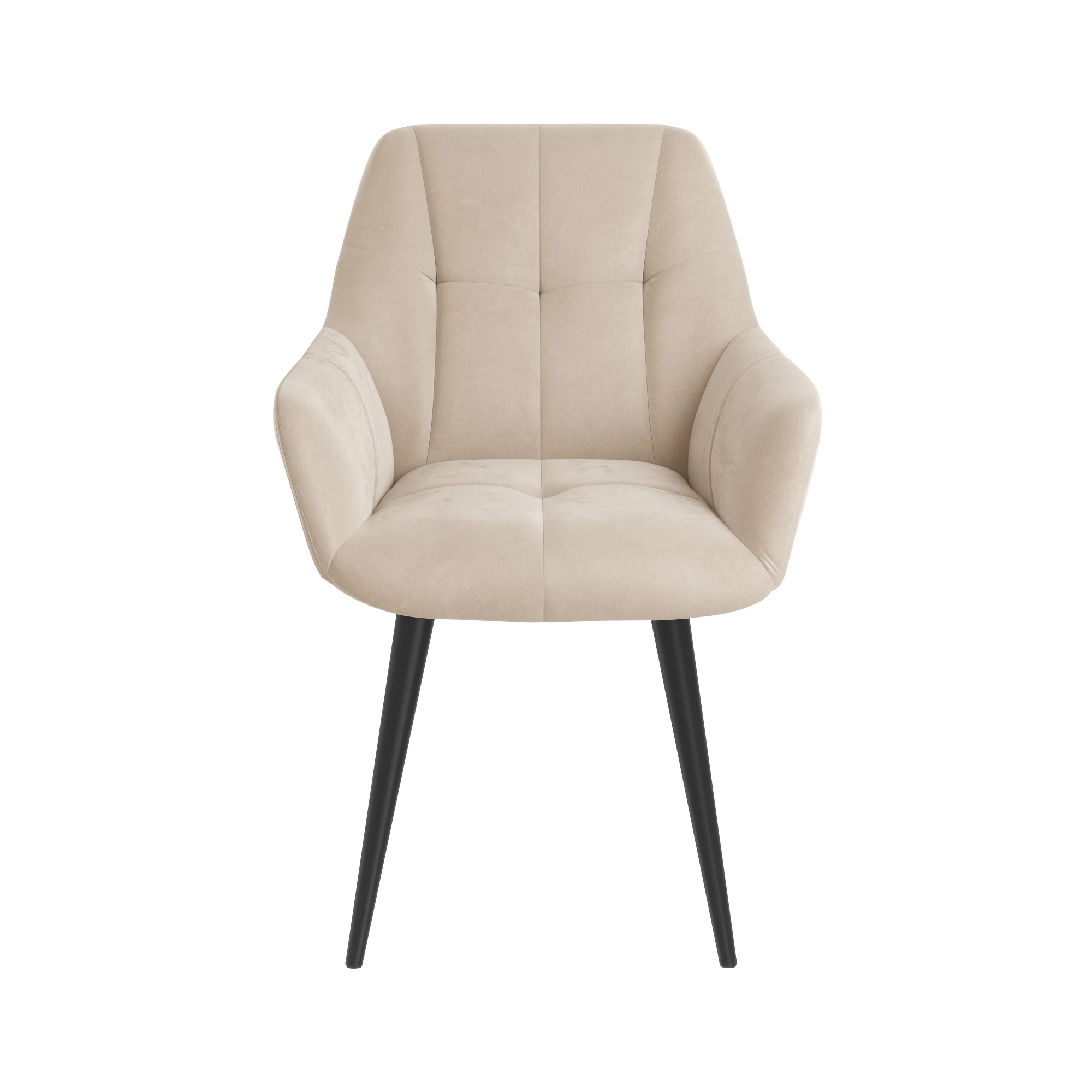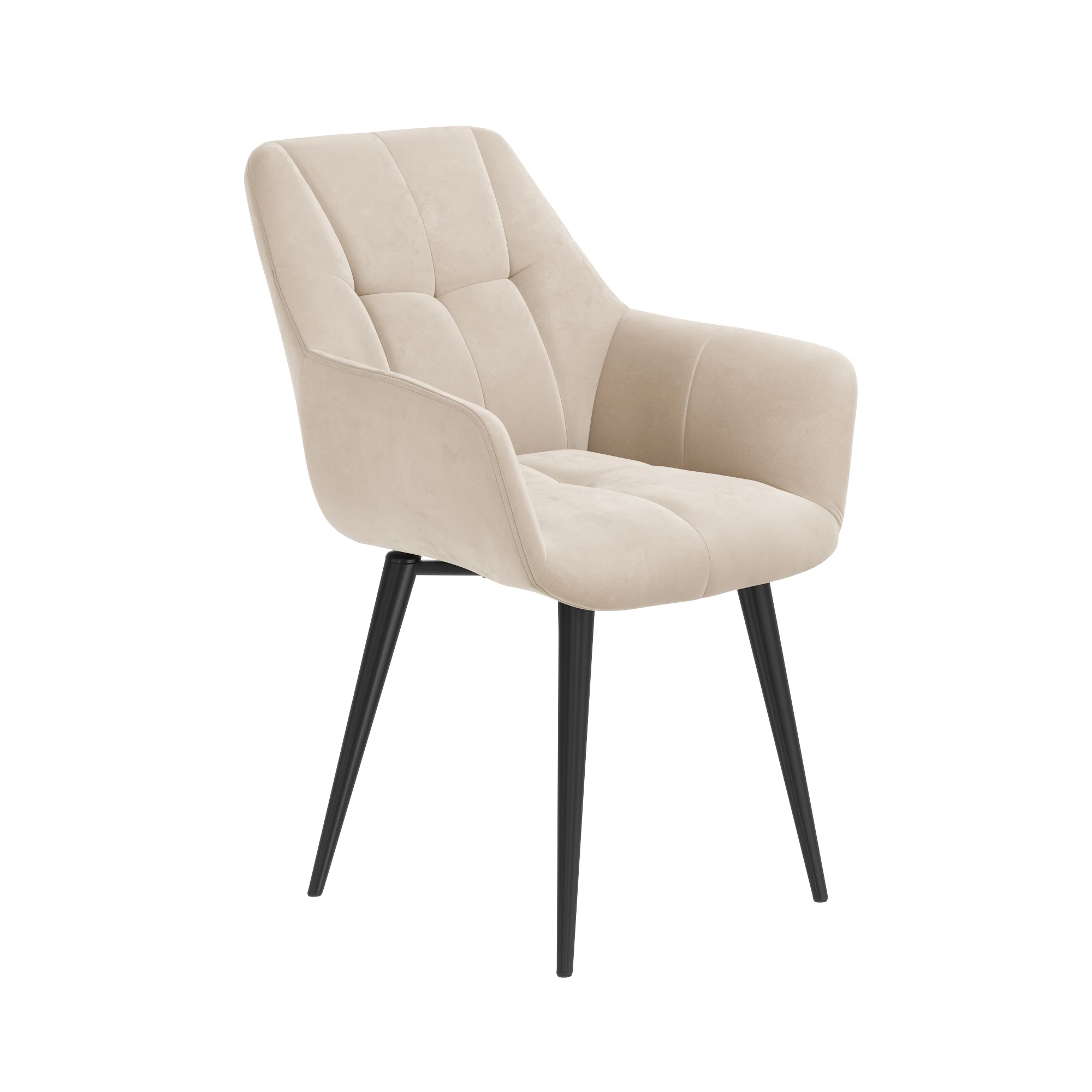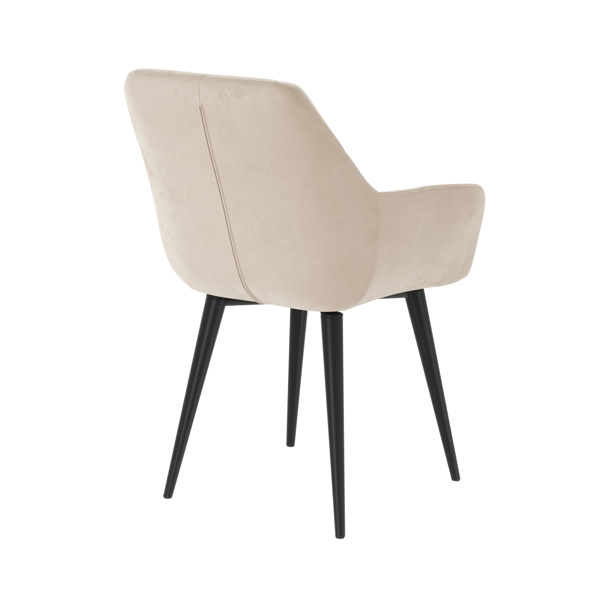 Дизайн модели отличается аккуратными утяжками и строчкой на спинке, сиденье и подлокотниках. Обивка стула выполнена из велюра с элегантным блеском.
