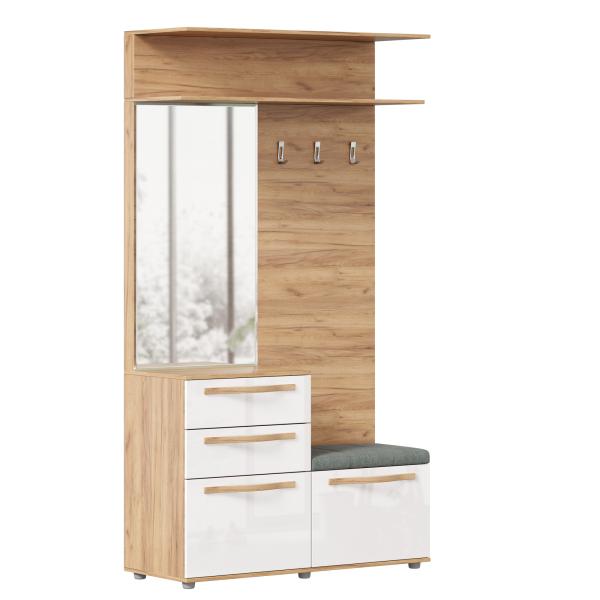 • Справа – 3 крючка. Внизу тумба с мягким сиденьем и ниша за откидной дверью на кронштейне.