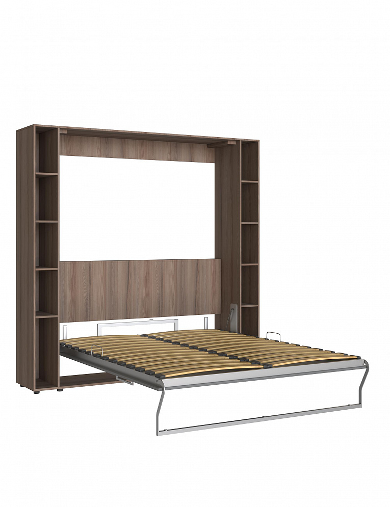 Открывается кровать за ручки на фасаде. Шкаф для кровати оснащен ребром жёсткости для фиксации корпуса в вертикальном положении, но в нем нет задней стенки для сохранения экономичности.